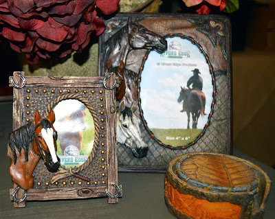 Gift Trio: 2 horse picture frames and etched mountain scene/leaf coasters. (US addresses only)
