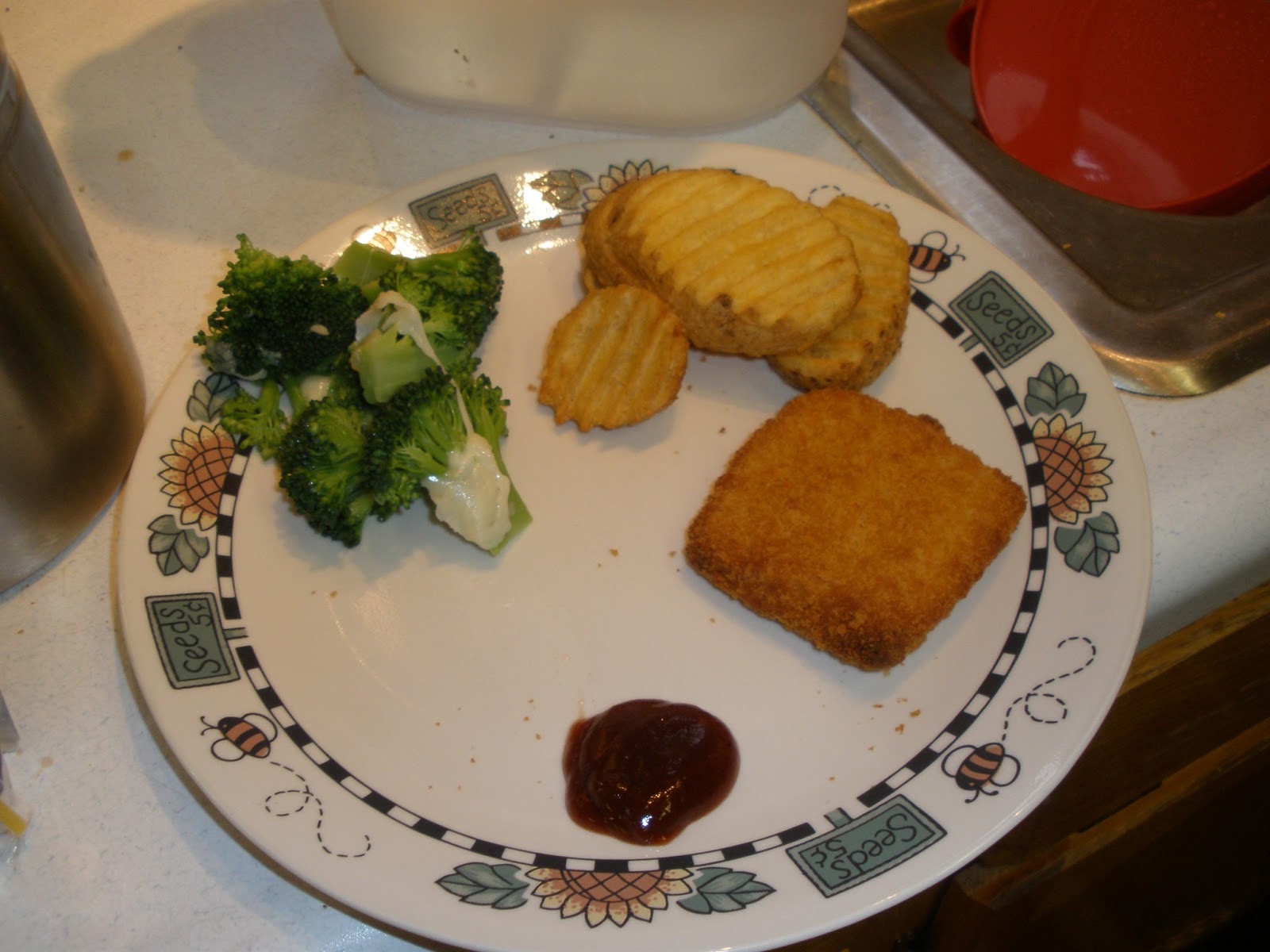 I chose to eat it on a thin bun, and it was amazing! I loved the flavor, and my dad did, too. You can see that we had some wonderful potatoes and broccoli as well (with a little cauliflower, too). I hardly had to put any sauce on the patty. Just a little sauce and a piece of cheddar.